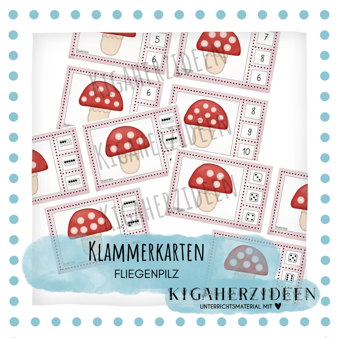 Diese Klammerkarten mit fröhlichem Fliegenpilzmotiv machen das ZÀhlenlernen spielerisch leicht. Die Kinder zÀhlen die Punkte auf dem Pilz und klammern die passende Zahl an der Seite an.